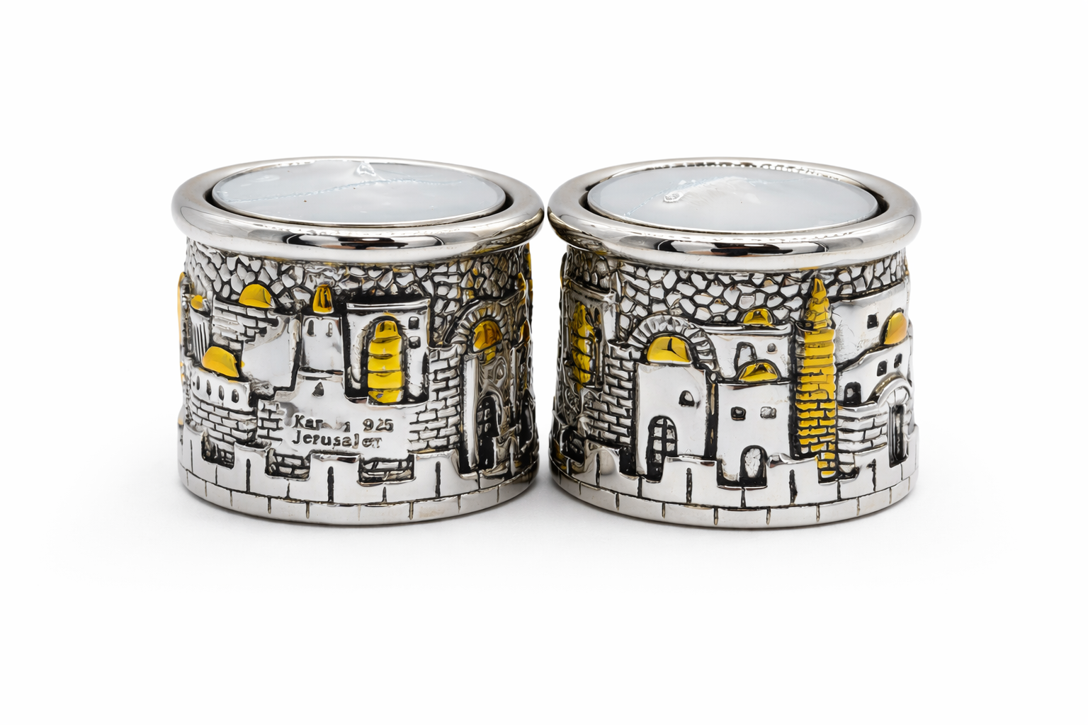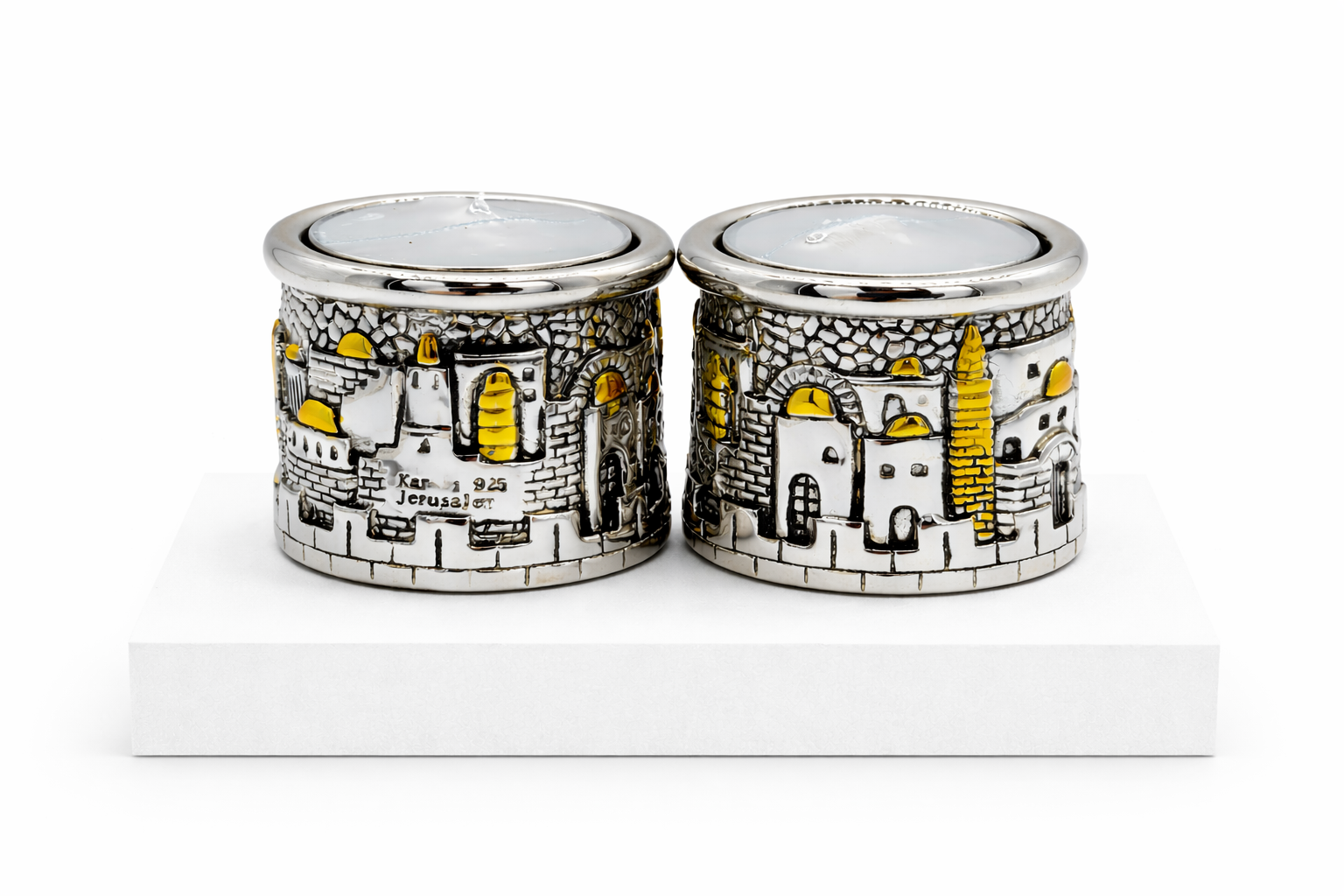 מחזיק נר מעוצב של Hadarya עם תבליטי נופי ירושלים והדגשות זהב. פריט דקורטיבי מיוחד המוסיף אווירה ירושלמית חמה לבית.