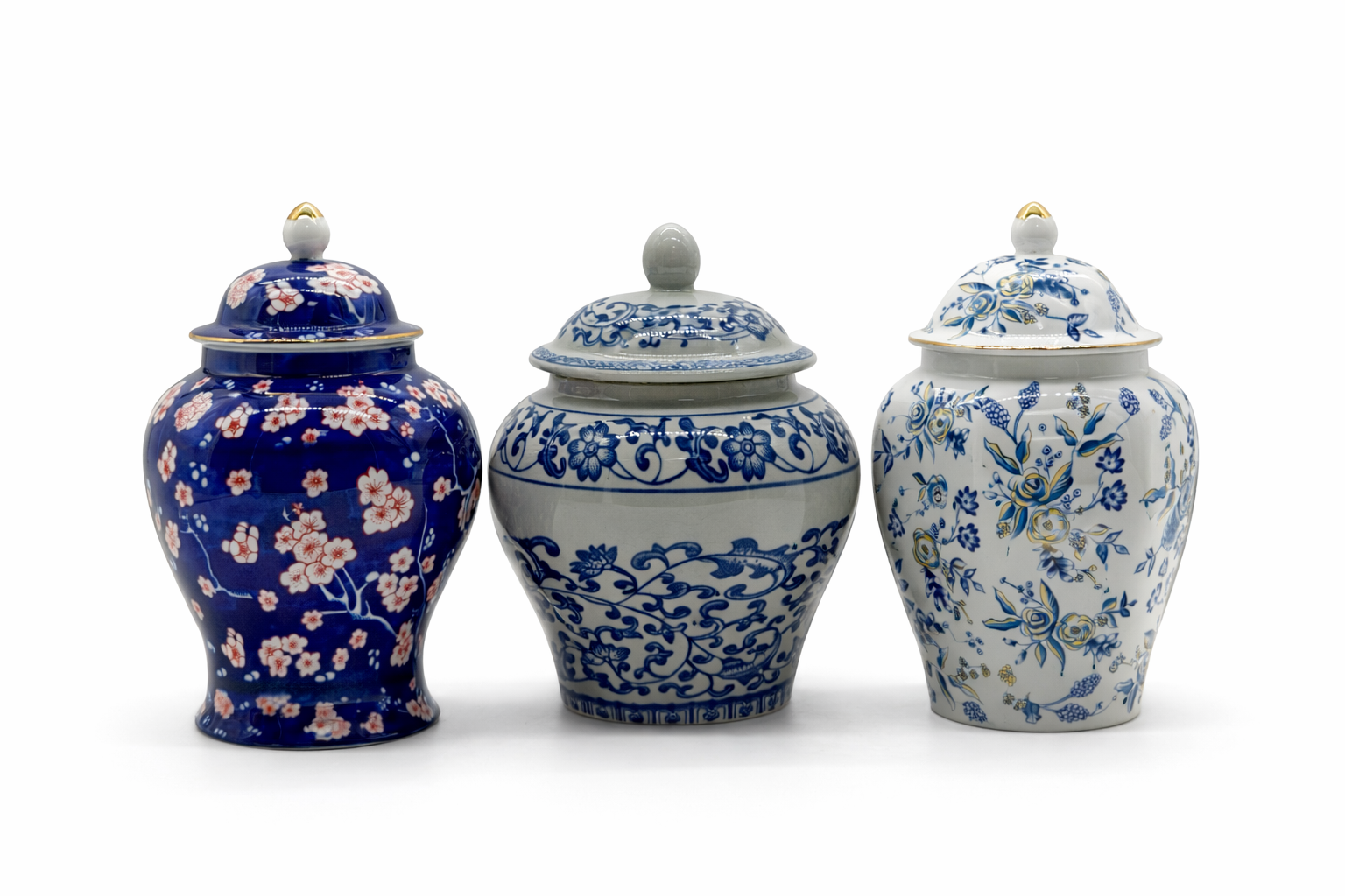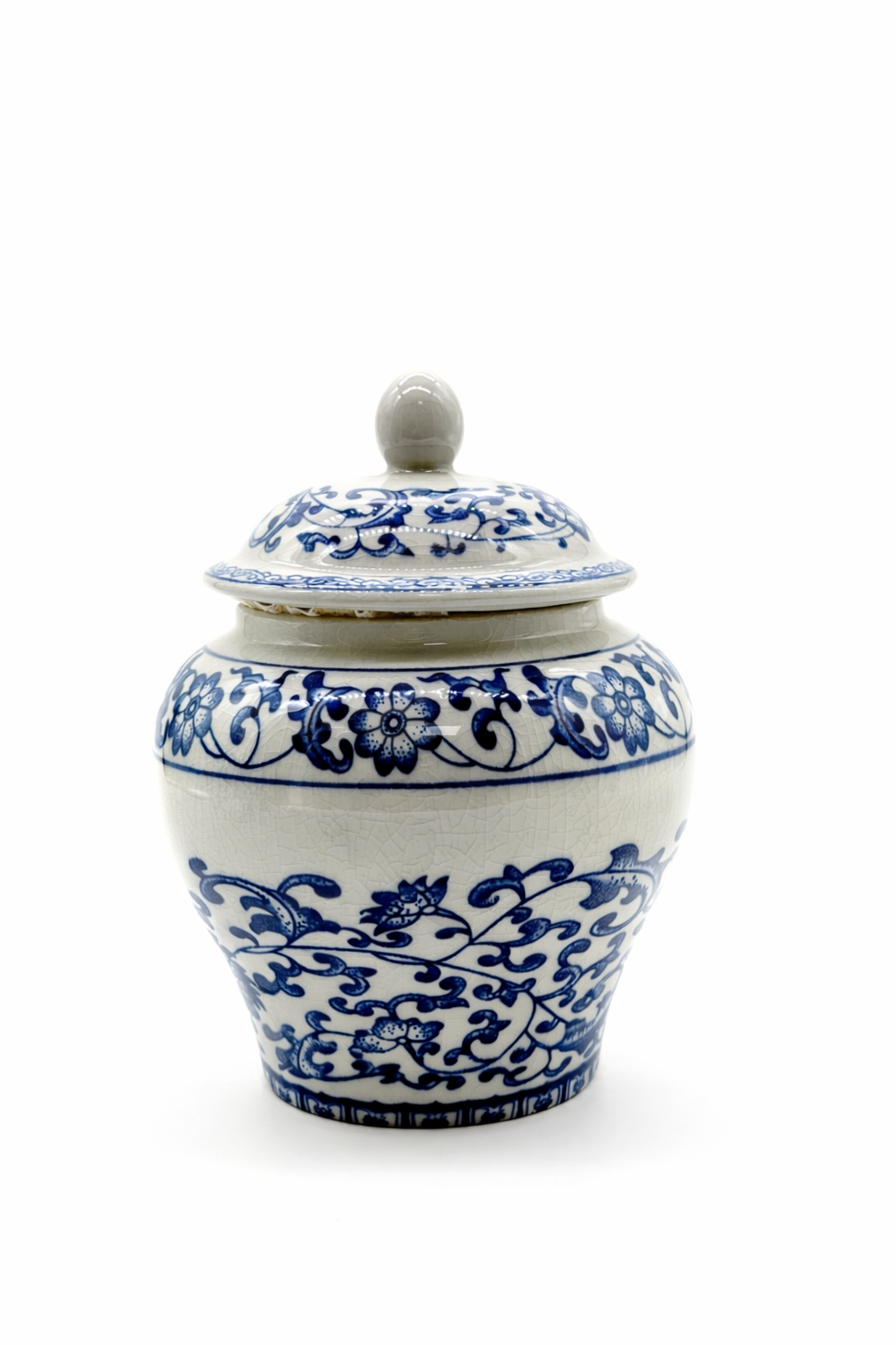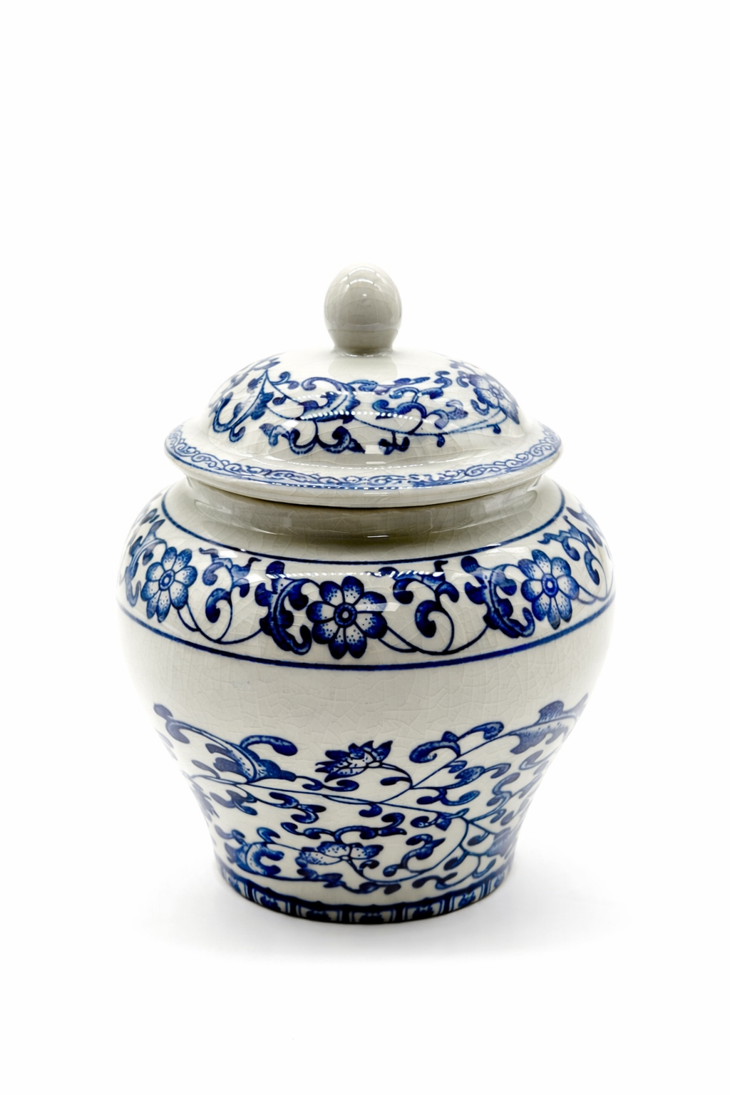 אגרטל קרמיקה מכסה פרחוני כחול-זהב