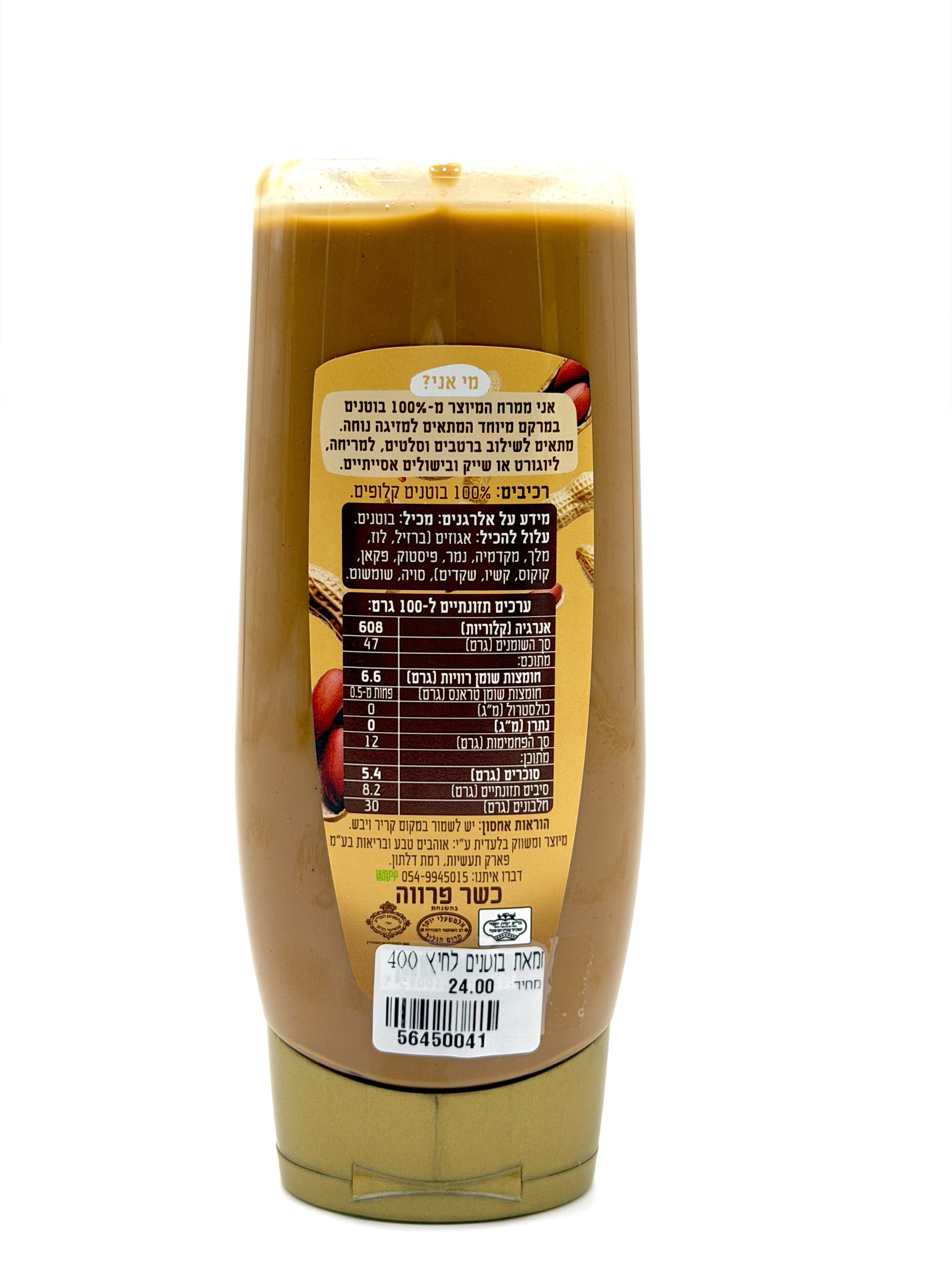 חמאת בוטנים טבעית מבית השקד בבקבוק לחיץ – ללא תוספת סוכר או מלח, עשירה בחלבון ובטעם.