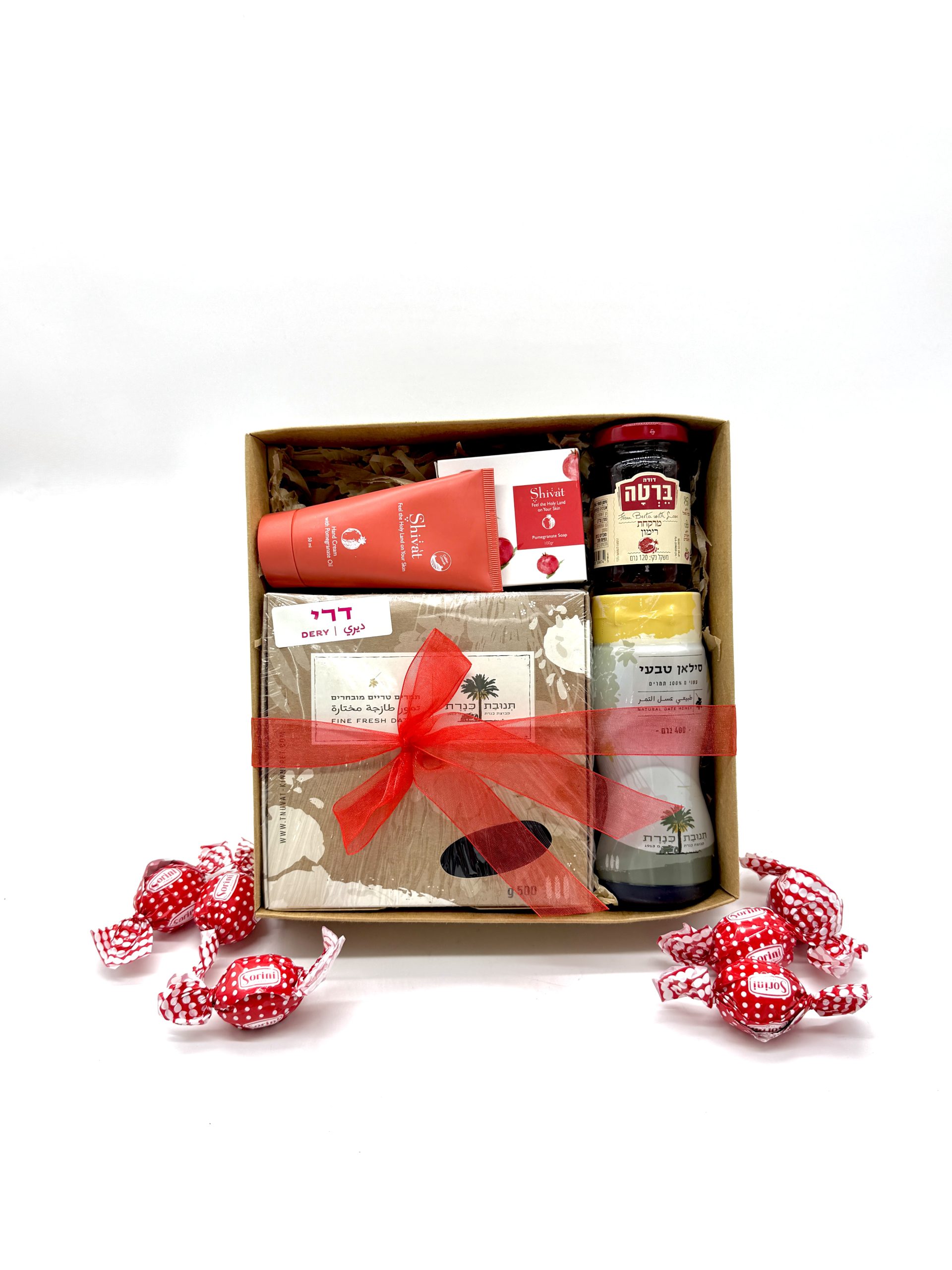 מארז איכותי מתנובת כנרת המשלב בין טעמי החקלאות המקומית לבין מוצרי טיפוח טבעיים בניחוח רימון.