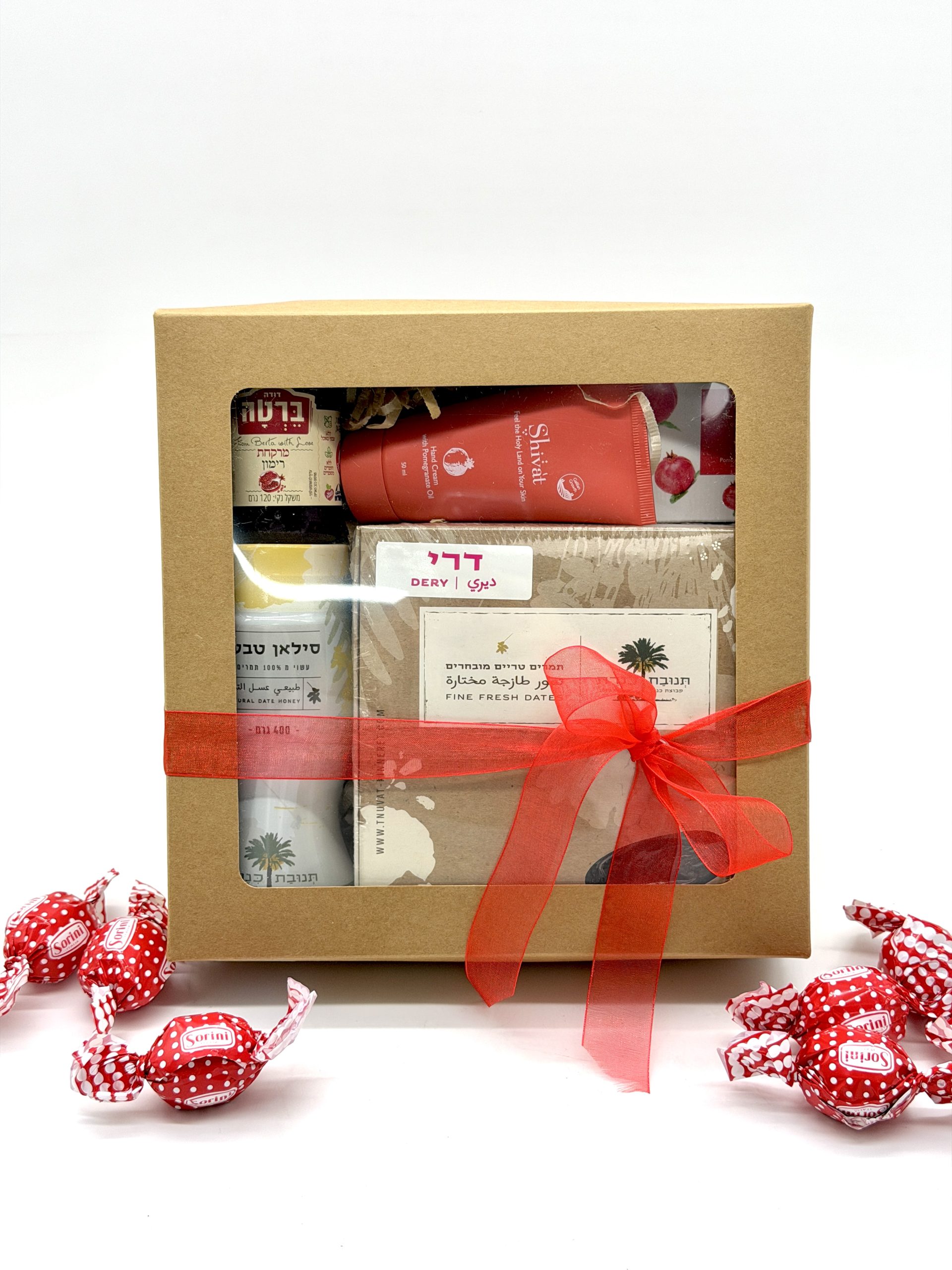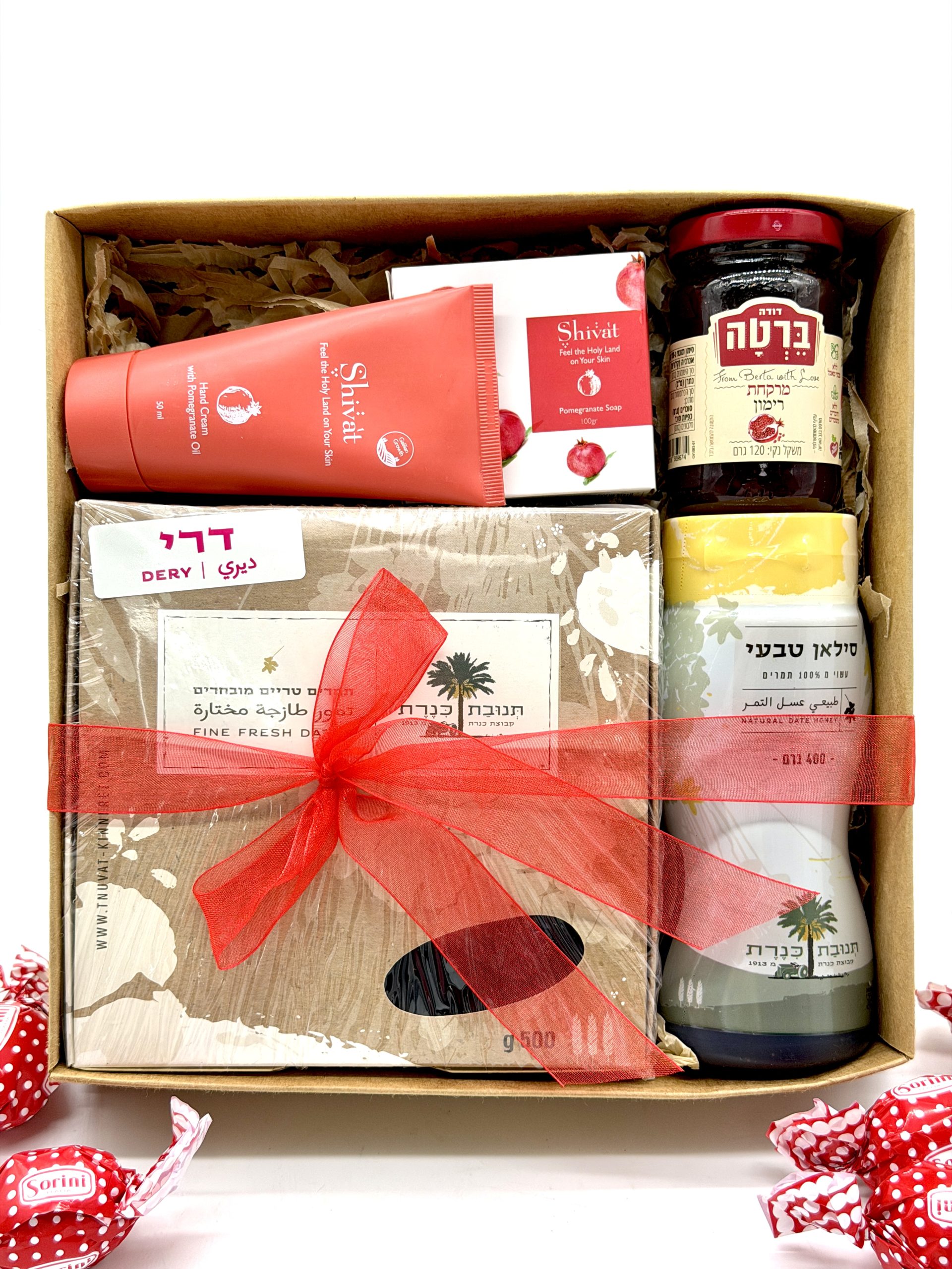מארז ייחודי מתוצרת מקומית הכולל תמרי דרי, סילאן, מרקחת רימון ומוצרי טיפוח טבעיים.