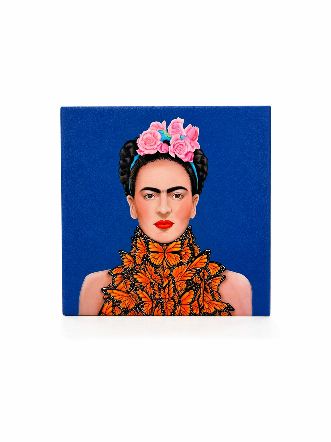 תחתית קרמיקה בעיצוב פרידה קאלו על רקע כחול עמוק – מראה נקי, מודרני ומרשים.