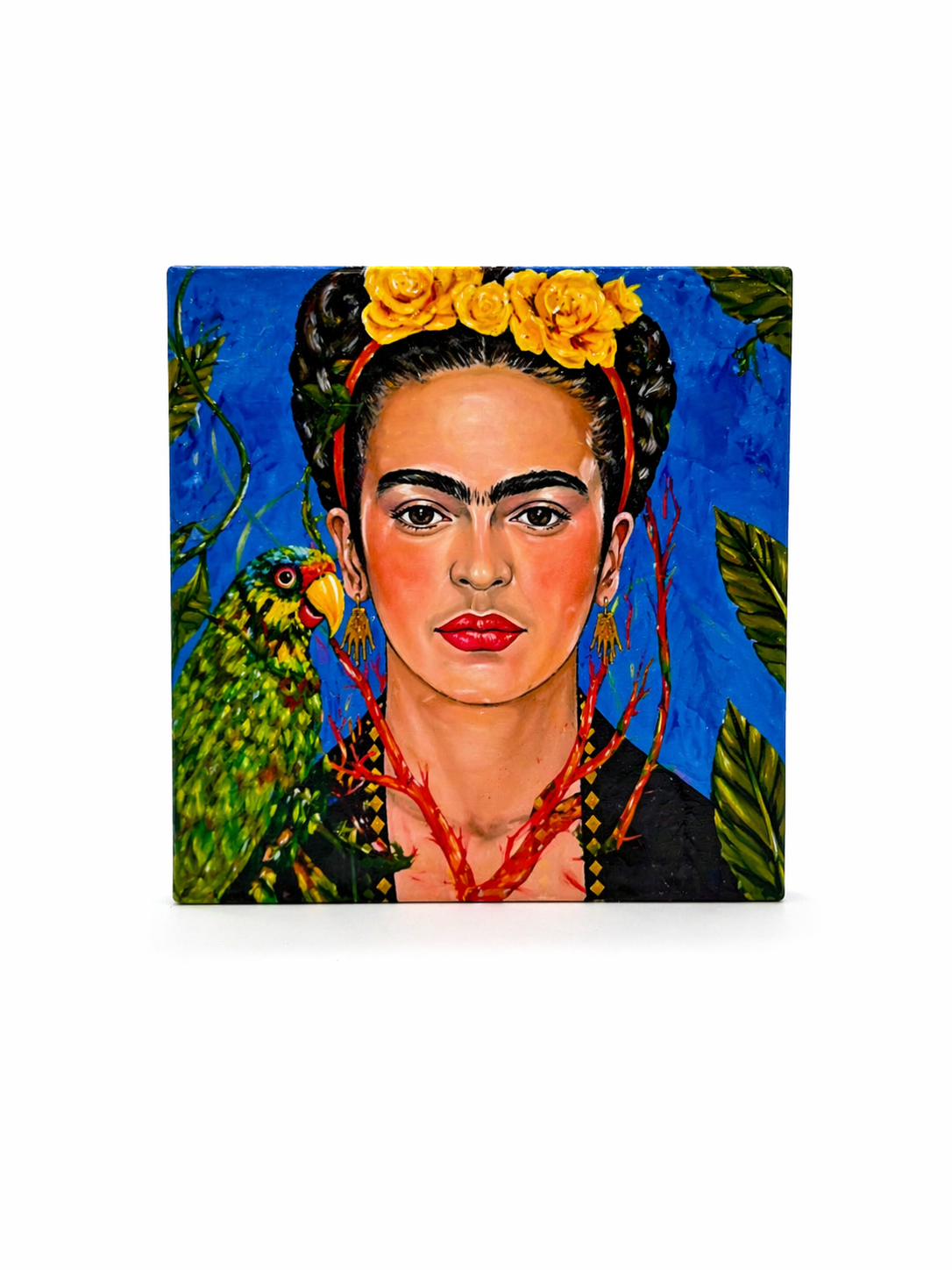 תחתית קרמיקה בעיצוב פרידה קאלו עם רקע כחול עשיר, פרחים צהובים ותוכי צבעוני – פריט מלא חיים ונוכחות.